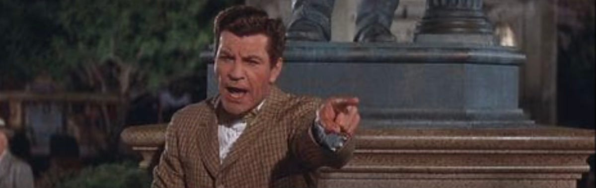 Robert Preston telling the town of River City, Iowa that “they’ve got terrible, terrible trouble.” Just like the Donnelly Public Library is telling its public. (Scene from the 1960’s movie “The Music Man”)