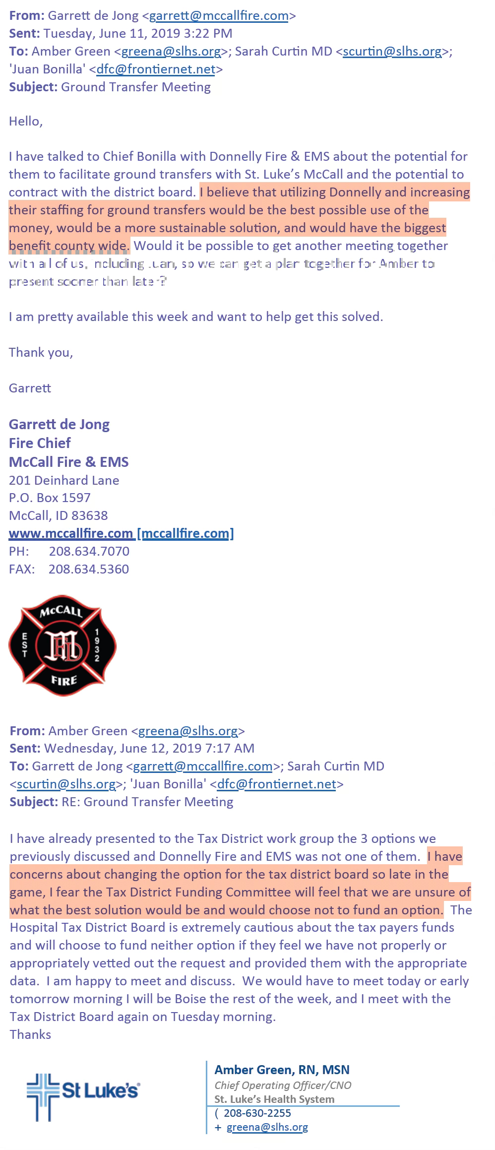 "I have already presented to the Tax District work group the 3 options we previously discussed and Donnelly Fire and EMS was not one of them. I have concerns about changing the option for the tax district board so late in the game, I fear the Tax District Funding Committee will feel that we are unsure of what the best solution would be and would choose not to fund an option."—Reply from St. Luke's McCall Chief Operating Officer